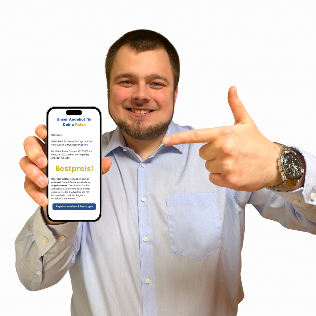 Erhalte mit wenigen Klicks ein verbindliches Angebot für Deine Uhr. Innerhalb von 24 Stunden und ohne vor die Haustür zu gehen!